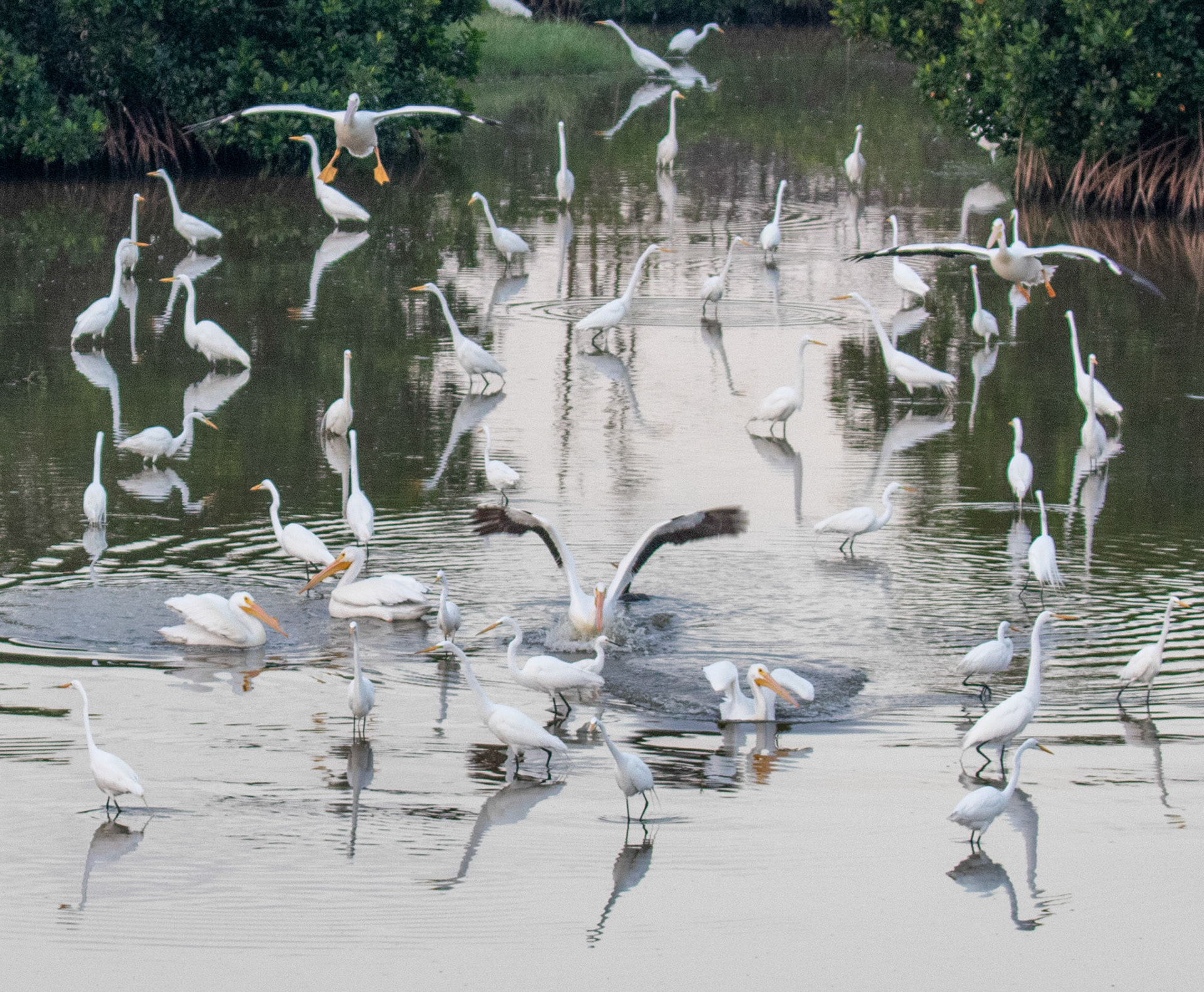White Pelicans forage in groups