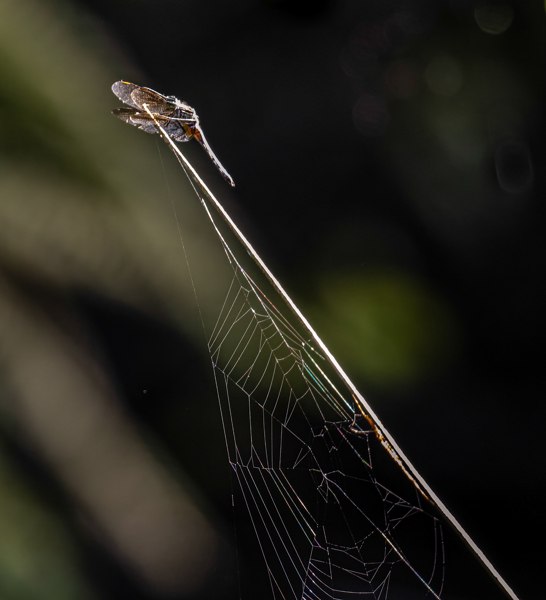 Dew covered Tangled & Orb Webs in morning sunlight
